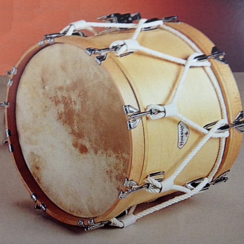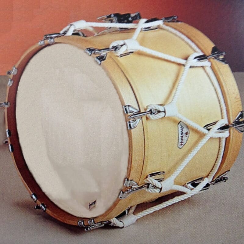 - Aros de madera vista.- Casco acabado en madera lacada.- Parches de plástico o piel.- 8 Tensores independientes por parche.- Cuerda decoración.