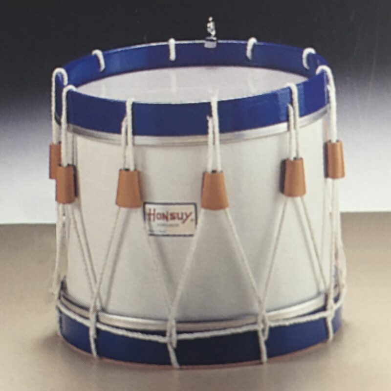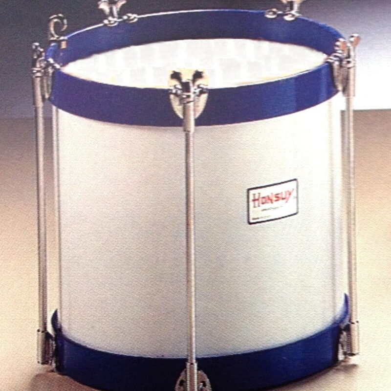 Tamboril marca Honsuy de 30,5cm. (12") de diámetro x 26cm. de altura (10"). Casco y aros de madera contrachapado. El casco va forrado de blanco y los aros se pintan en color azul (los colores de la bandera de Galicia). Se montan con parches de plástico. Tensión mediante 6 varillas