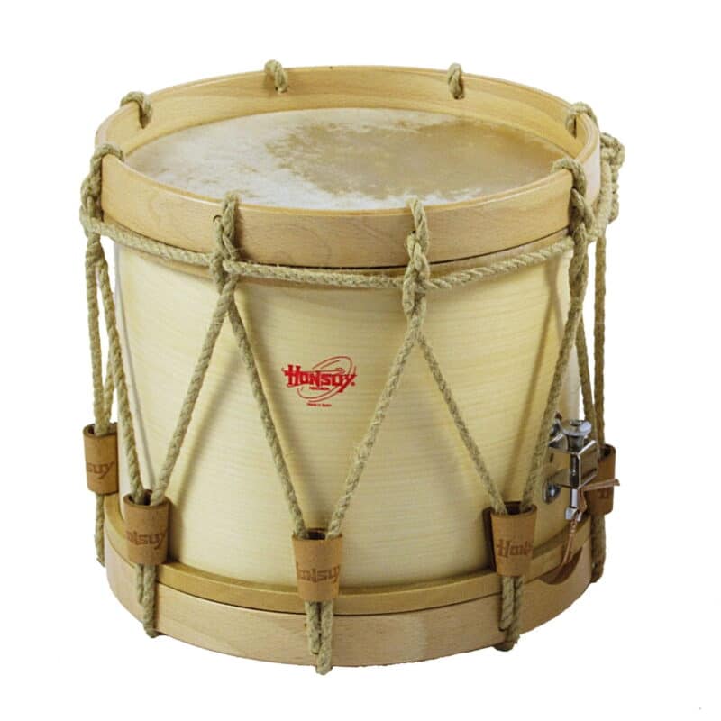 Tamboril gallego marca Honsuy de 25cm. (10") de diámetro x 25cm. de altura (10"). Casco y aros de madera contrachapado acabado natural. Se montan con parches de piel natural. Tensión mediante cuerda de cáñamo de 4 mm. de diámetro y 8 tensores de piel natural.