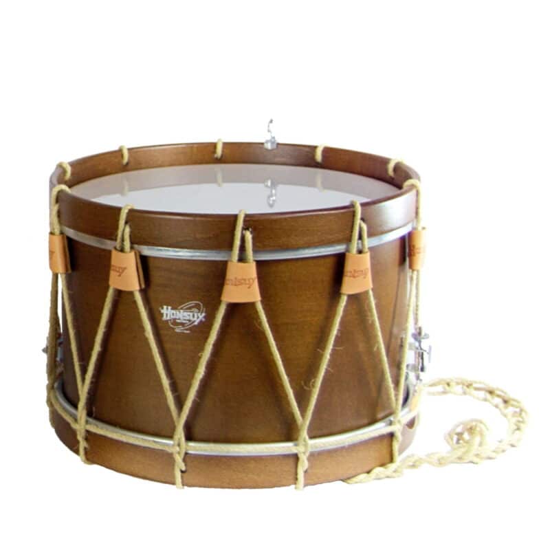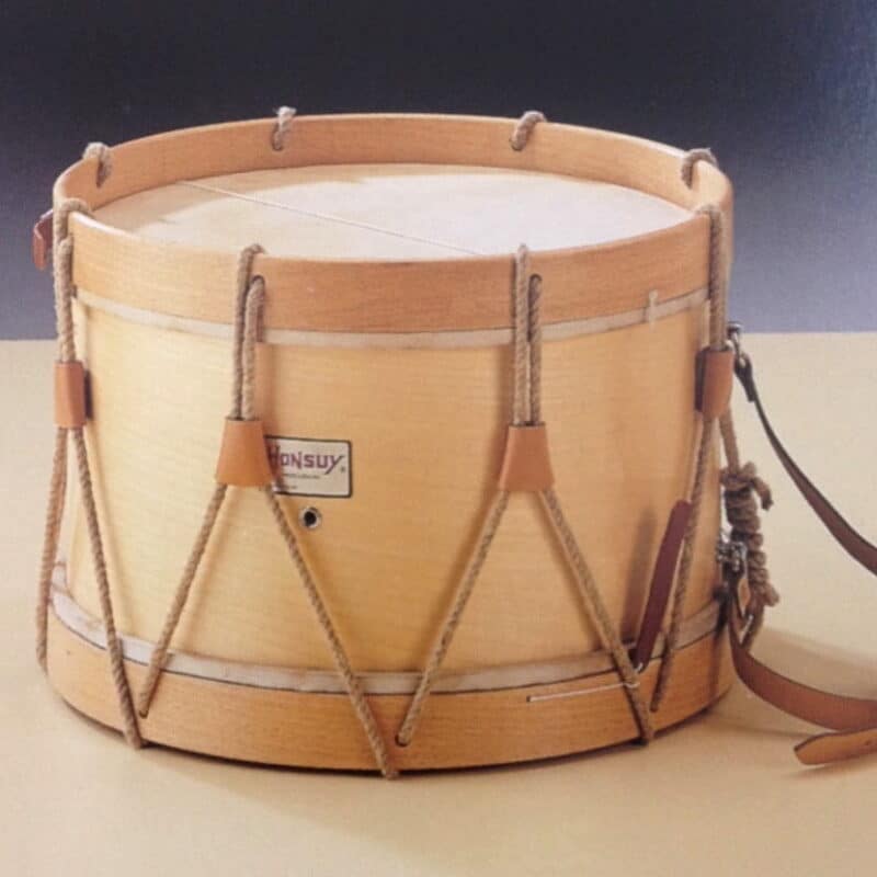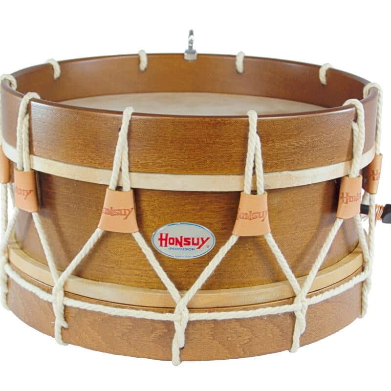 Tamboril txistulari marca Honsuy de 25cm (10”) x 28cm. (11”). Casco de madera contrachapada acabado nogal y aros de madera contrachapada acabados en negro. Se montan con parches de plástico Honsuy. Tensión mediante cuerda de nylon con 10 tensores de piel negros y bordones.
