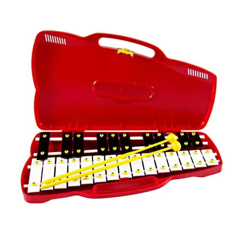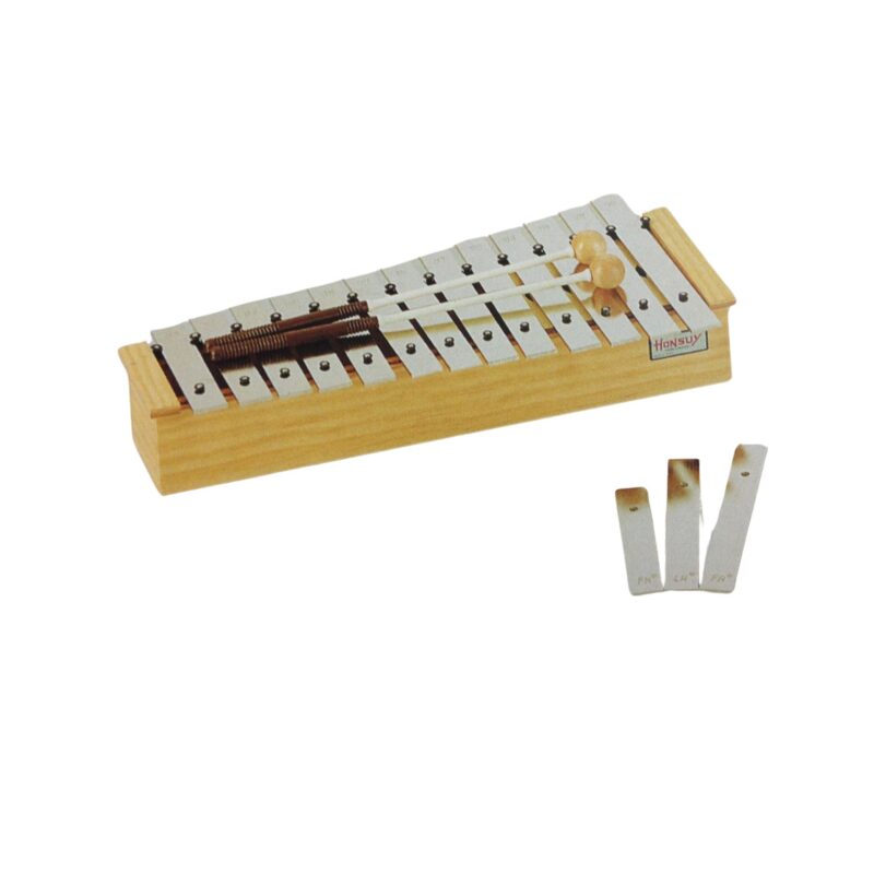 - 2 Cajas armónicas de madera.- 1 Pares de mazas.- 22 Láminas de acero de 20 x 3 mm. Niqueladas.
